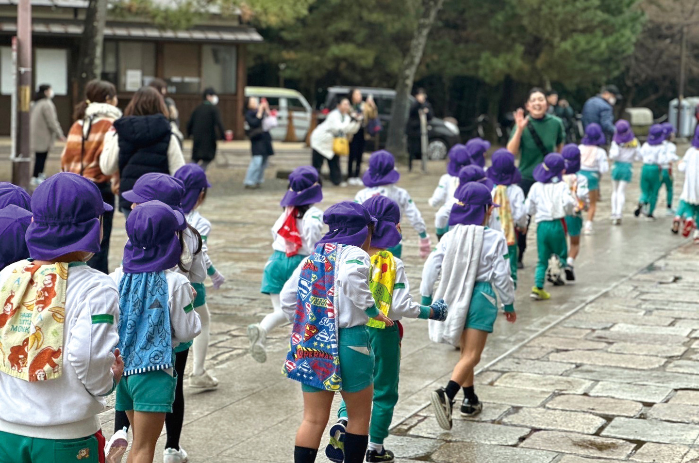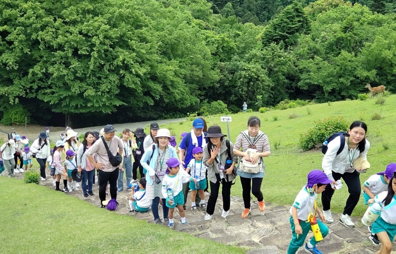 親子で楽しい1日を過ごします。年長児(紫組)は、若草山一重目まで登山をします。また、年少児(赤組・桃組)は奈良公園まで散策し親子ゲームなどを楽しみます。