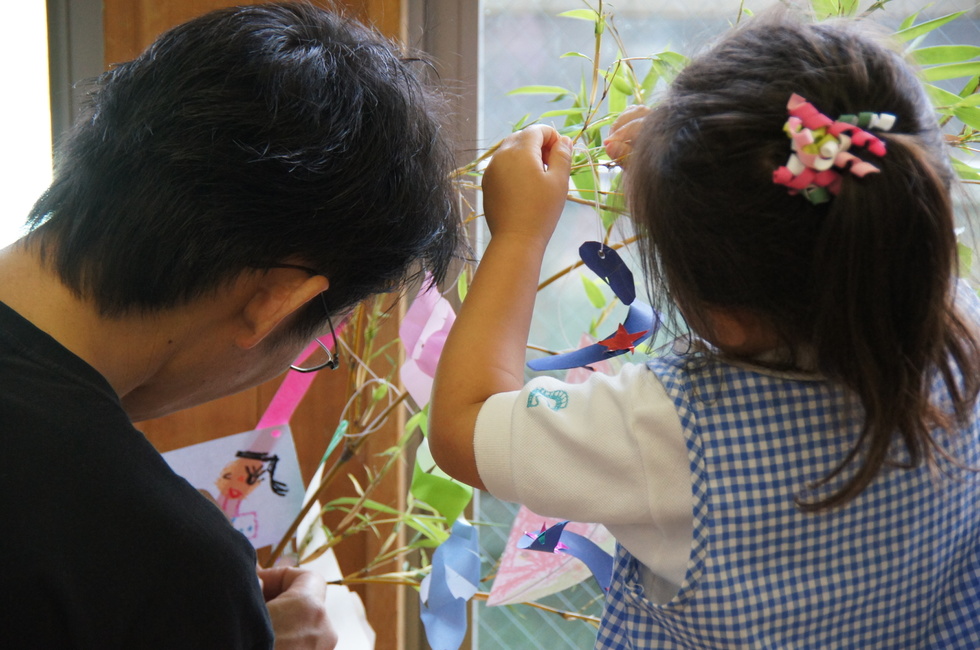親子で笹に飾るものを製作します。園内にある竹林から採った笹に飾って家に持ち帰ります。