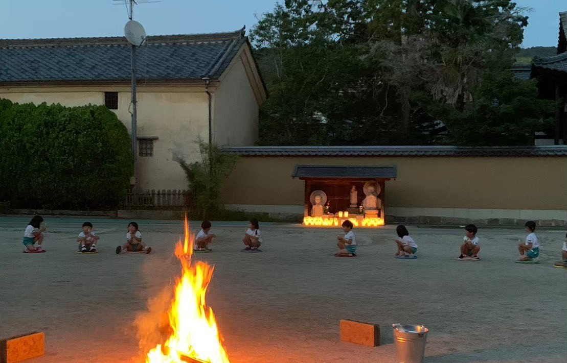 年長児(紫組)が幼稚園でお泊りします。キャンプファイヤー、花火、早朝の大仏殿参拝など様々な体験をします。また、クヌギの木にトラップを仕掛け、昆虫採集を行います。自然が豊富な当園では、カブトムシ、クワガタムシ、カナブン等が多く集ります。