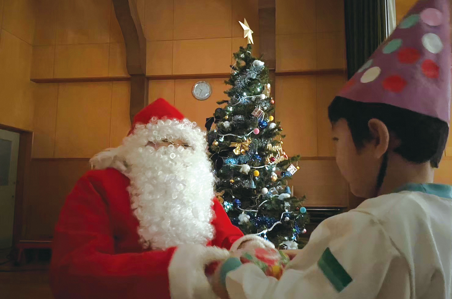 子ども達は、この年が楽しく過ごせたことを喜んで、歌を歌ったり一緒に遊んだりしたあと、サンタクロースからプレゼントを受け取ります。