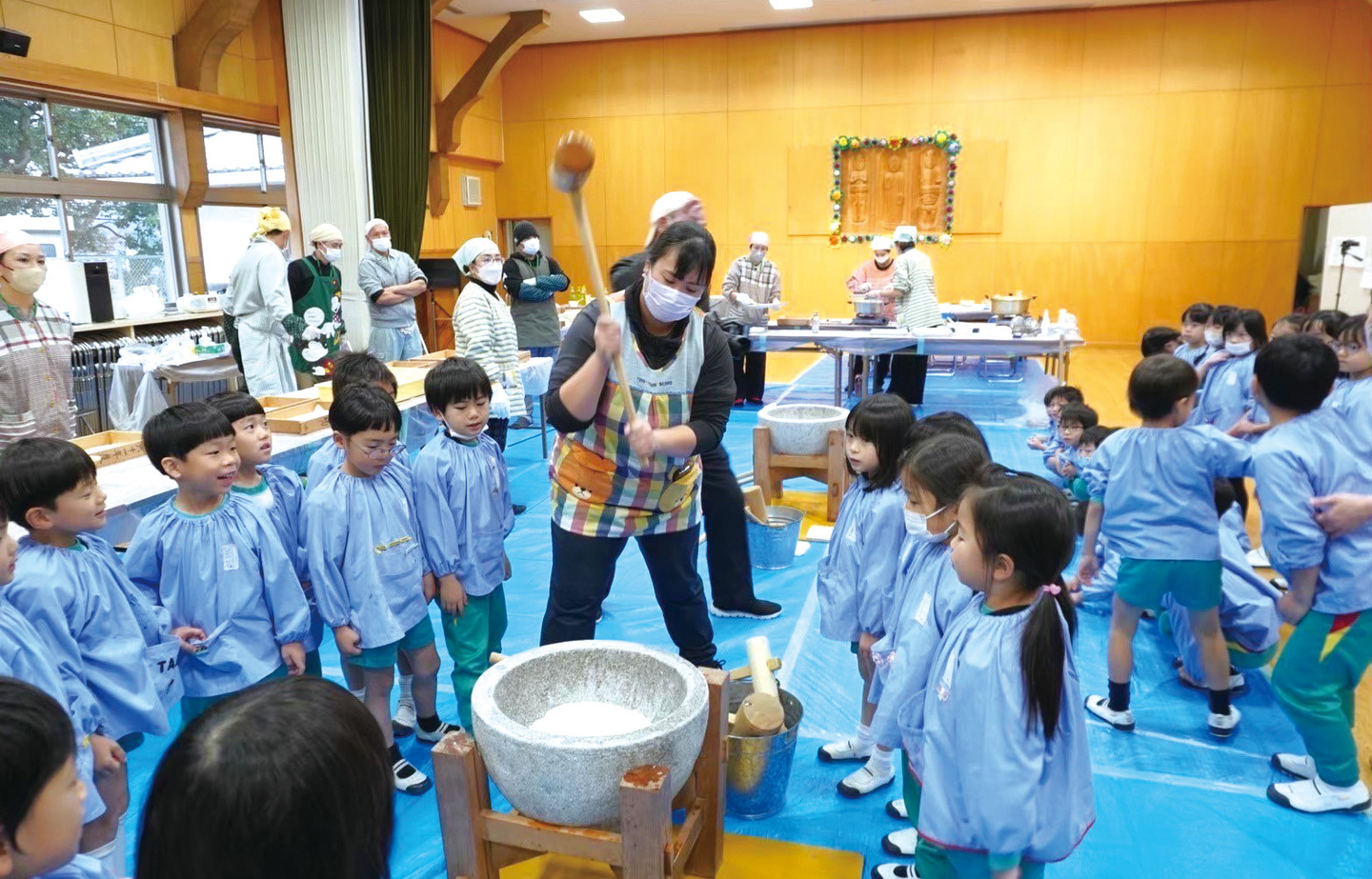 年長組が秋に稲刈りをした餅米を使ってみんなでお餅つきをします。