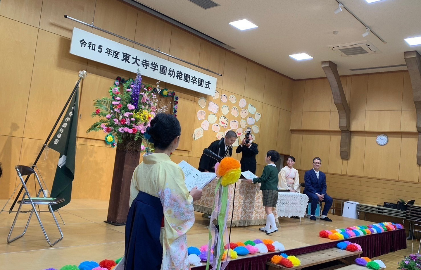 • 園生活をしめくくる卒園式は、華やかでひきしまった雰囲気の中で行われます。卒園式のあとは、卒園児と保護者が揃って、大仏殿中門石段のところで記念写真を撮り、大仏殿に最後の参拝をします。