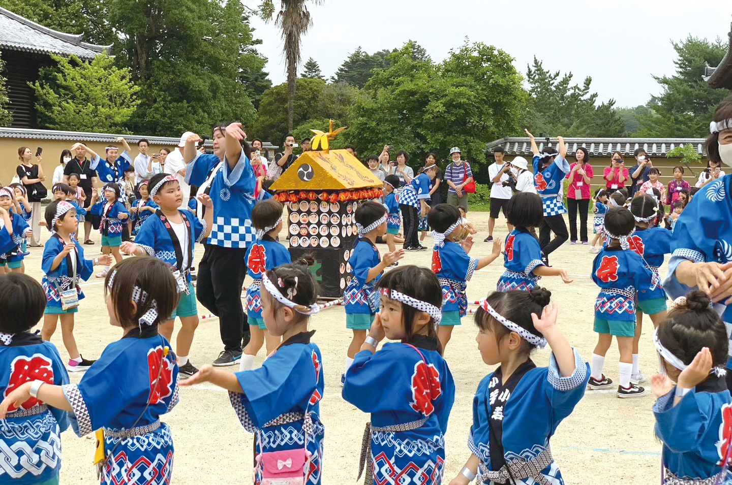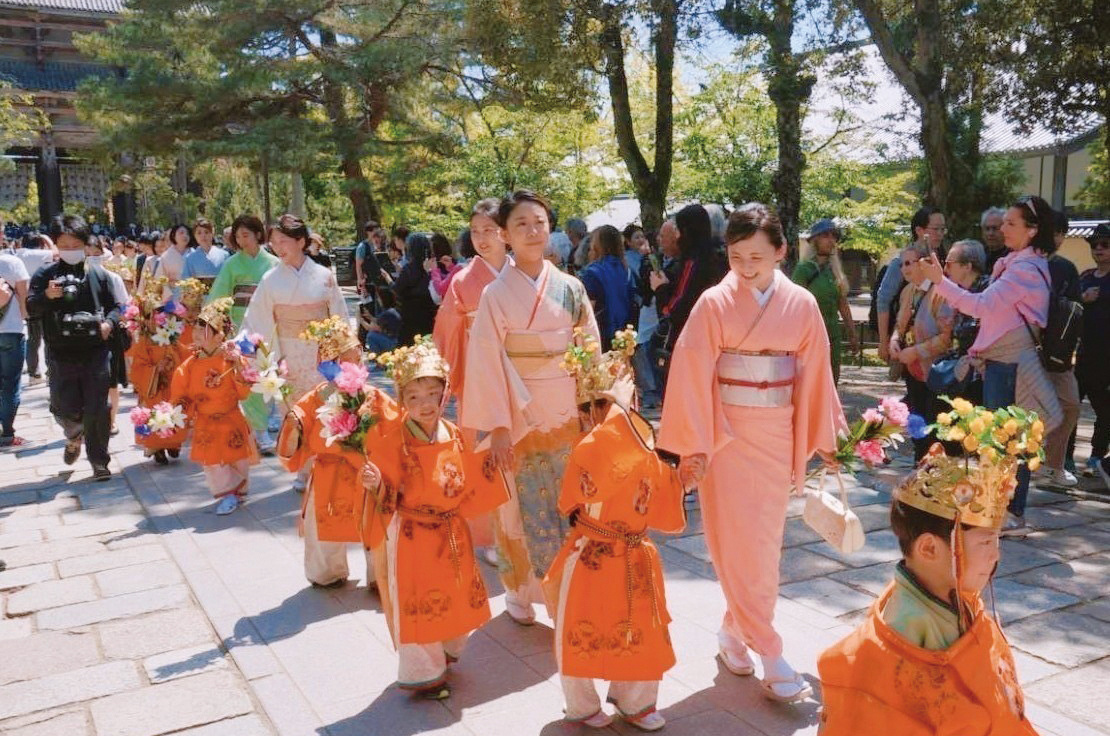 毎年5月2日、大仏さまを建立された聖武天皇の御命日を記念して行われます。東大寺の年中行事でも特に華やかなお祭りです。年長児を中心とした稚児行列が先導して歩きます。