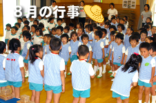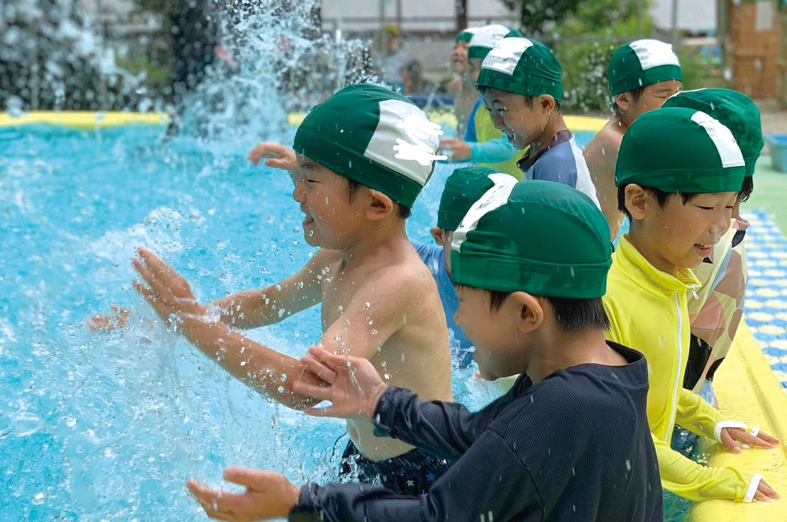 園児達が大変楽しみにしている遊びの一つです。3歳児から順次内容を高めていくことによって、水に対する興味や慣れが次第に進み、個人差があるものの全員が、水に親しんで楽しく遊ぶことができるようになります。